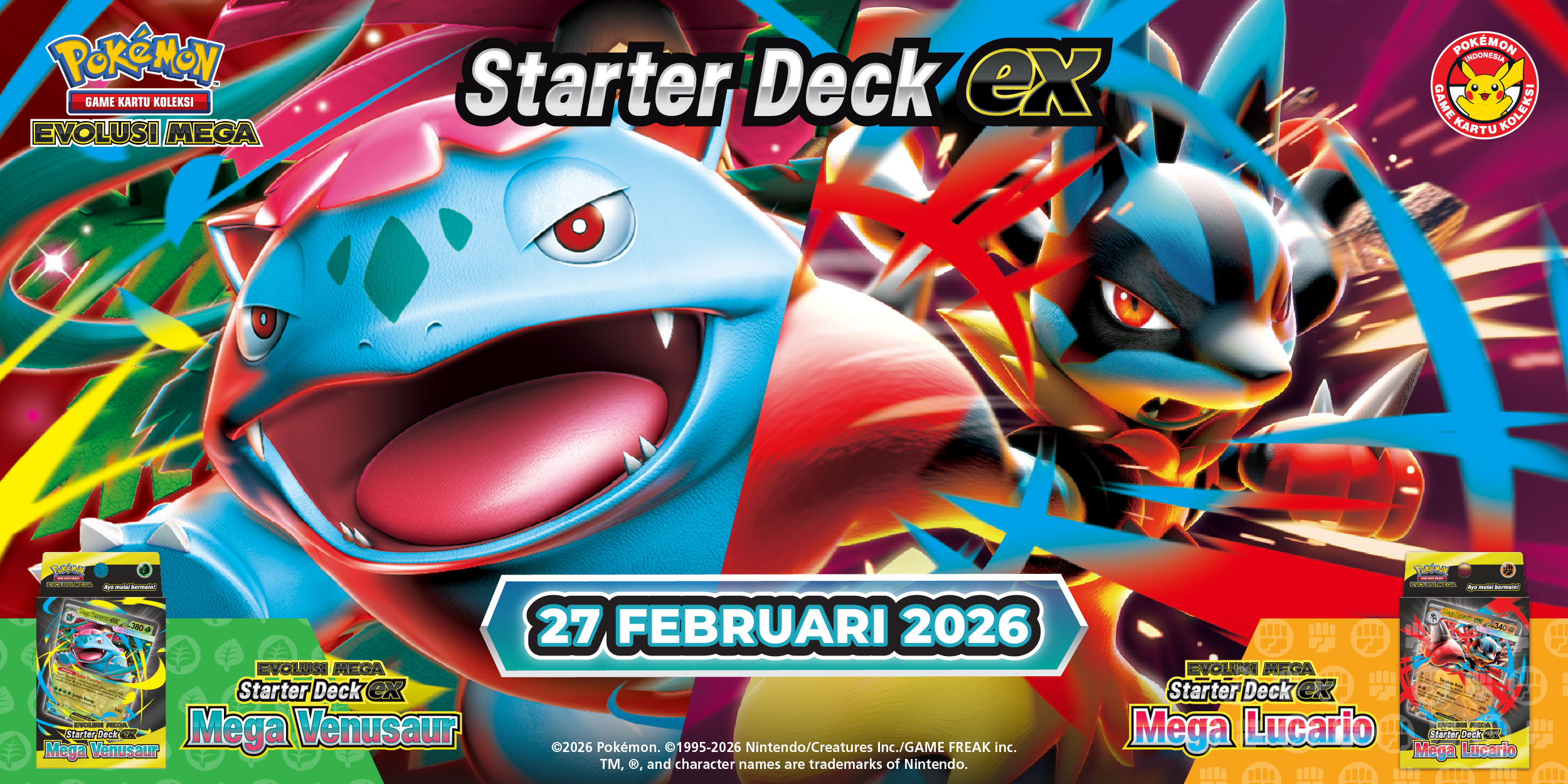 Starter Deck ex Mega Lucario dan Mega Venusaur resmi hadir mulai 27 Februari 2026. Untuk pertama kalinya, Pokémon Evolusi Mega ex tersedia dalam format deck siap main yang cocok untuk pemula maupun pemain yang ingin strategi baru.